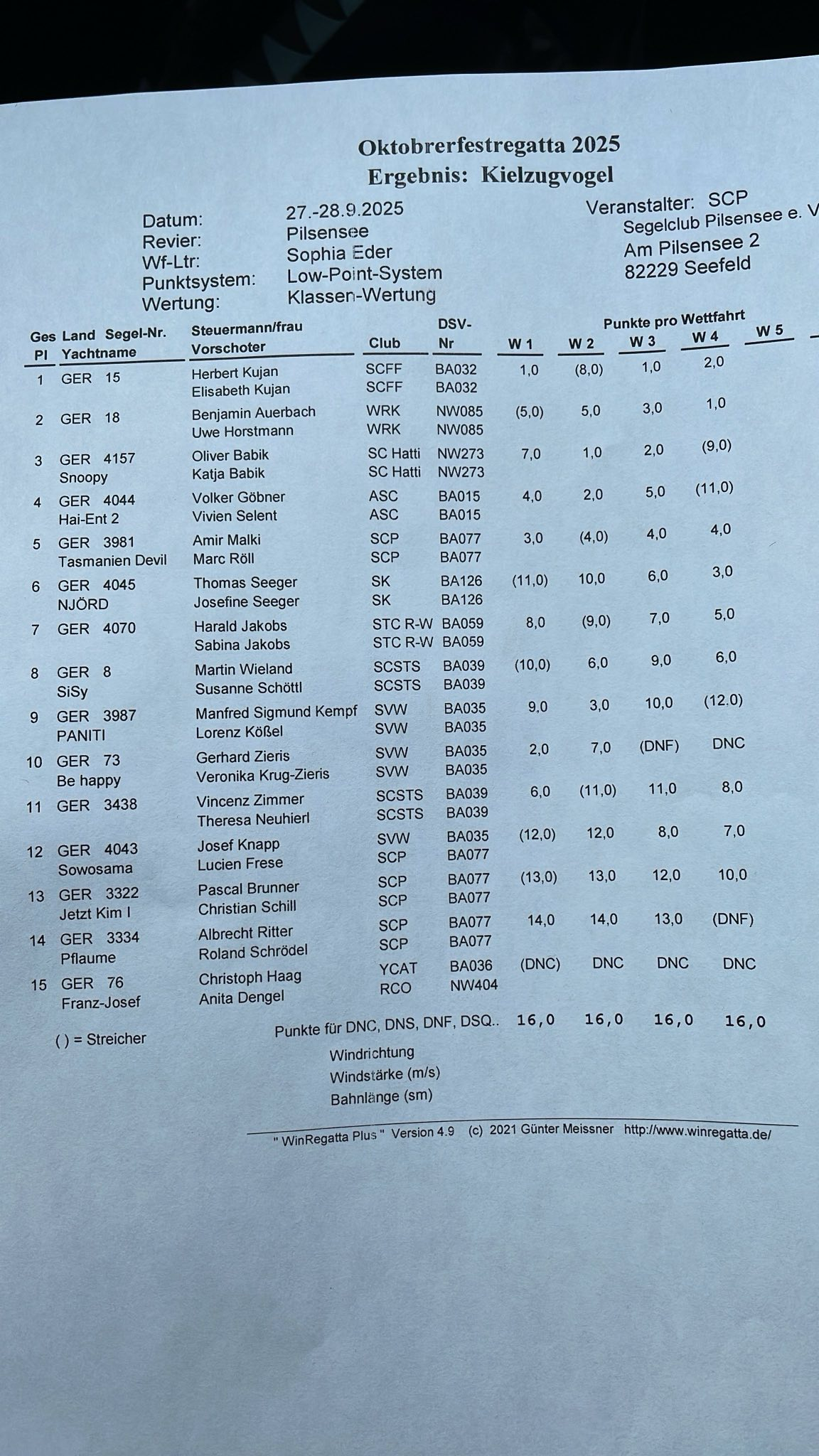 Und nun wollen wir auch die Spannung auflösen und die Gewinner benennen: Der zweite Platz im letzten Rennen reichte Herbert und Elisabeth Kujan (SC Füssen/Forggensee), um mit nur vier Punkten (bei einem Streicher) die Oktoberfestregatta am Pilsensee mit klarem Vorsprung zu gewinnen. Zweite wurden Benjamin Auerbach und Uwe Horstmann von der WRK (Wassersportgemeinschaft Rumeln-Kaldenhausen 1961 e.V., Duisburg) mit neun Punkten. Sie verbesserten sich durch den Laufsieg im vierten Rennen erheblich. Einen Zähler dahinter landeten Oliver und Katja Babik (SC Hattingen). Auf Rang vier segelten Volker Göbner und Vivien Selent (Augsburger SC), punktgleich vor Lokalmatador Amir Malki mit Marc Röll (SC Pilsensee) – die dreimal Vierte waren, nur im ersten Lauf nicht.