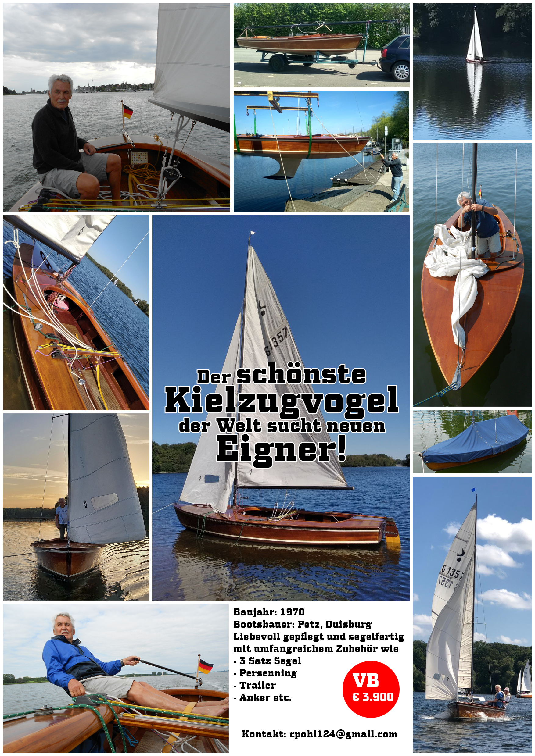 AdministratorLiebe Kieler.Ich schreibe Ihnen bezüglich meines Vaters, Horst Pohl und seines Kielzugvogels G1357 von der Sechs-Seen-Platte in Duisburg.Er sagte mir, er sei kürzlich aus der Kieler Klassenvereinigung ausgetreten. Ich weiß nicht ob Sie sich persönlich kannten.Vor drei Wochen ist mein Vater verstorben. Glücklicherweise konnte ich die letzten 2 Monate seines Lebens bei ihm sein, ich lebe ansonsten in Indien. In dieser Zeit waren seine Gedanken so oft bei seinem Kielzugvogel. Auch mein Leben hat dieses Boot maßgeblich geprägt, ein Jahr nach meiner Geburt hat mein Vater es erworben und somit gab es das Boot aus meiner Perspektive „schon immer“ und legte den Grundstein für meine eigene Segel-Leidenschaft.Mir kommt nun die Aufgabe zu, einen neuen Eigner für den Kieler zu finden (da sich mein Wunsch, ihn nach Indien zu segeln und in der Bucht von Bengalen anzusiedeln leider als unrealistisch erweist ;-).Ich bin mir nicht sicher, ob das Kieler Jahrbuch eine entsprechende Rubrik beinhaltet, aber ich sende Ihnen anbei einen Anzeige-Flyer für das Gesuch (bei Bedarf auch gerne nochmals in höherer Auflösung zum Print). Auch wenn es nicht ins Jahrbuch integriert werden kann, wäre ich Ihnen überaus dankbar, wenn Sie es digital in Ihren Kieler Netzwerken verteilen könnten.Ein zuverlässiger und leidenschaftlicher neuer Eigner ist dabei das Wichtigste, nicht der Kaufpreis. Noch eine Bemerkung zum Boot auf die mein Vater immer gerne hingewiesen hat: Der Kielkasten ist nach wie vor trocken!Ich bedanke mich im voraus für Ihre Hilfe und verbleibe mit einem freundlichen AhoiChristoph Pohl -