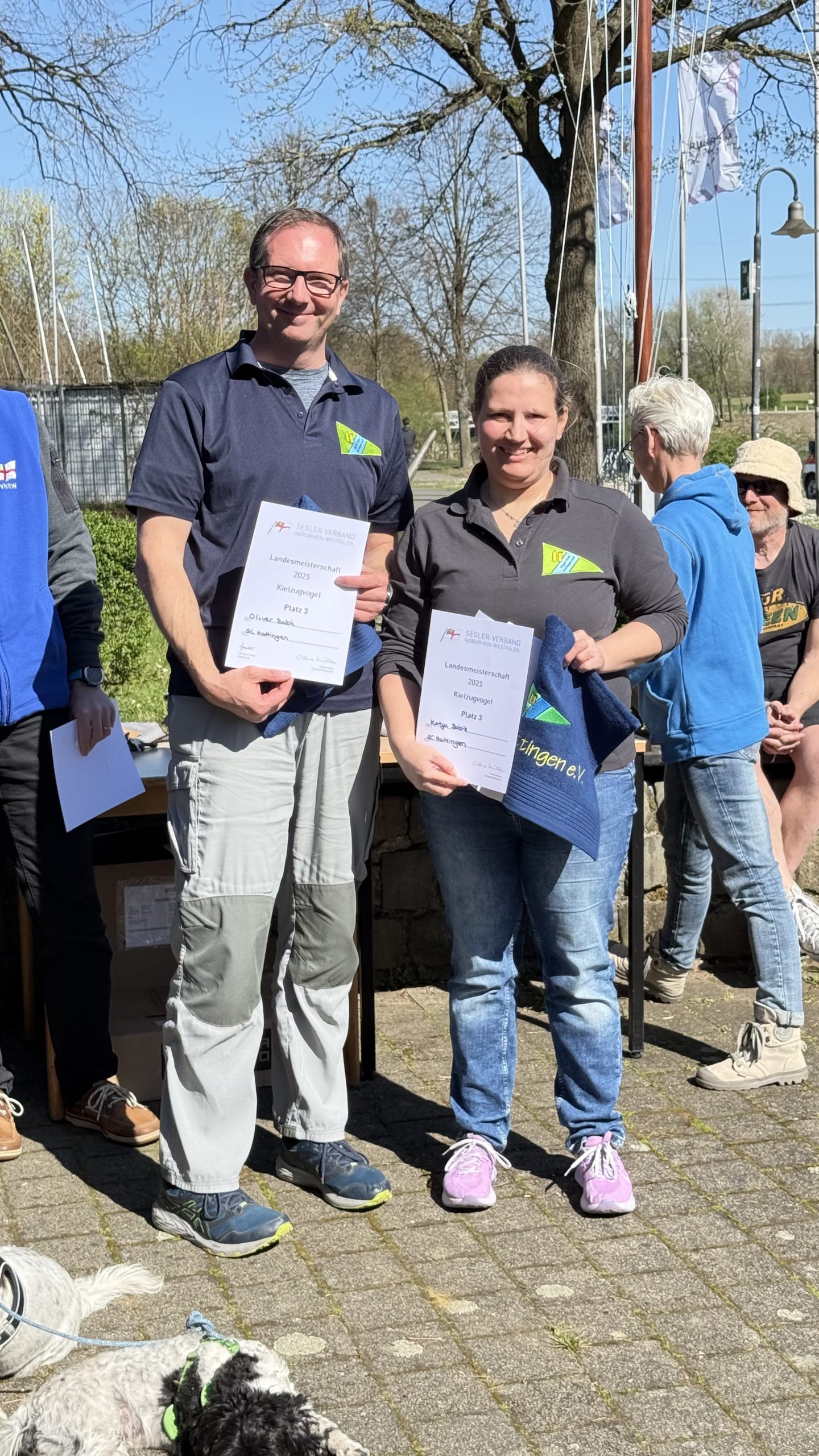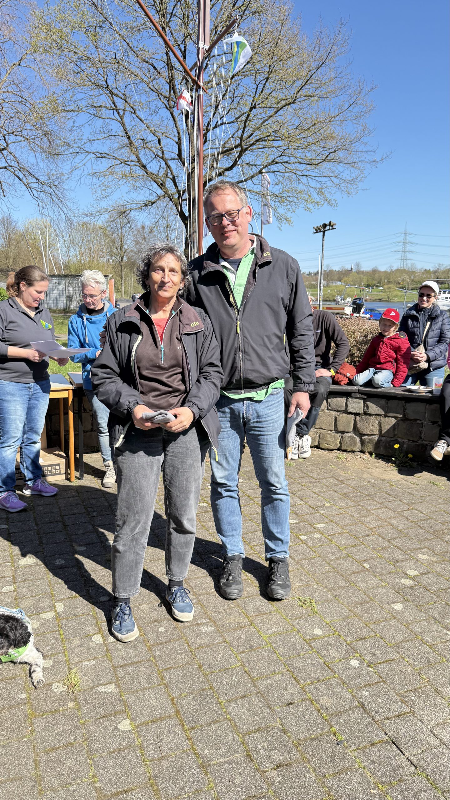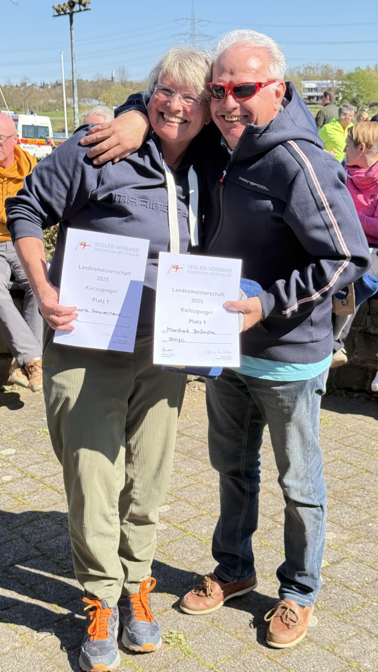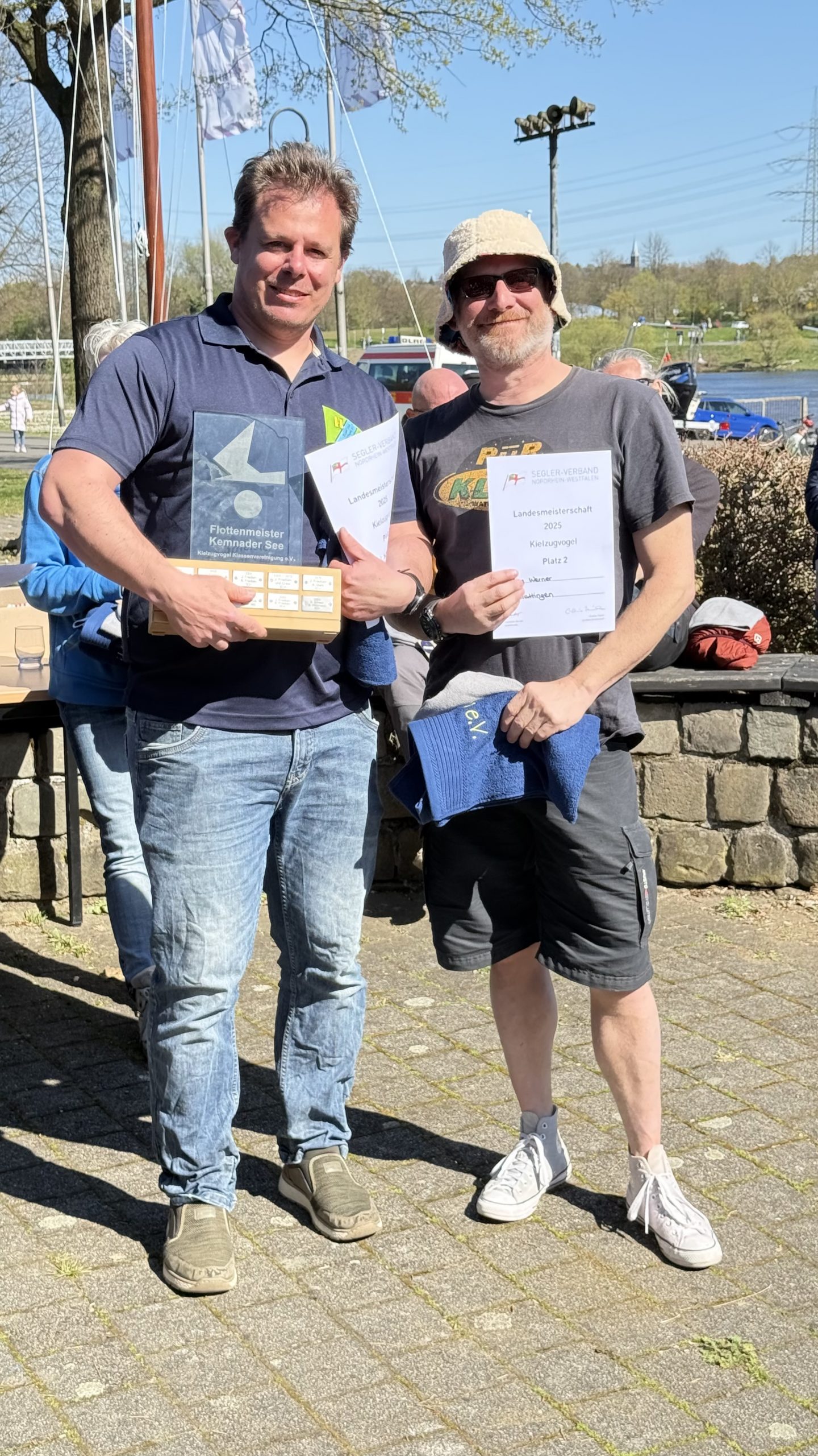 Sonntag wurde bereits um 10:00 Uhr gestartet. Die Wettfahrten waren etwas kürzer als Samstag, aber aus unserer Sicht vollkommen ausreichend, vor allem nach den anstrengenden Wettfahrten am Samstag. Wie schon gesagt, kam der Wind nicht optimal über den See, aber 3 bis 4 Bft waren zu viel Wind, um nicht zu segeln. Daher sind wir drei weitere Wettfahrten gesegelt und schließlich ließen sich Manni Brändle mit Steffi Gouverneur den Sieg nicht mehr nehmen. Da der Kielervorstand die Landesmeisterschaft NRW an die Kemnade vergeben hatte, wurden die beiden auch Landesmeister NRW und dürfen die Kieler im Herbst bei der Meisterschaft der Landesmeister vertreten. Die weiteren Podiumsplätze gingen an Daniel Scheer und Dag Werner vor Oliver und Katja Babik. Daniel Scheer konnte den Titel des Flottenmeisters der Flotte Kemnade verteidigen und durfte den Preis ein weiteres Jahr mit nach Hause nehmen.